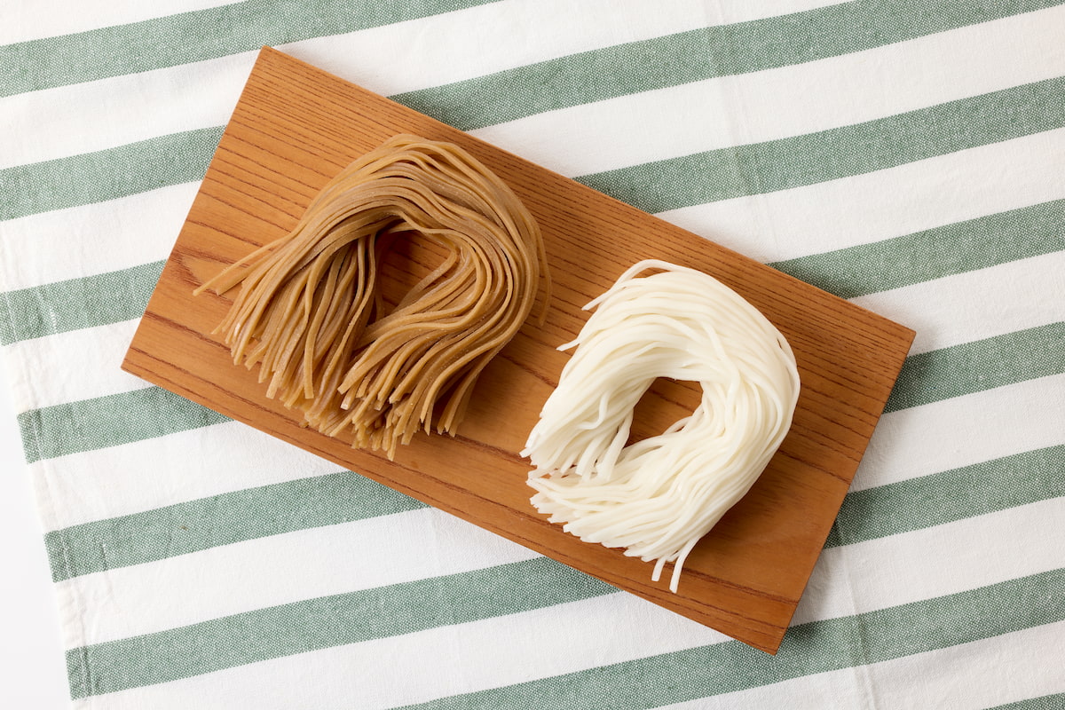 栄養価が高く、香ばしい味わいの「玄米めん」と、あっさりとした旨みが広がる味わいの「白米めん」の2種類をご用意いたしました。